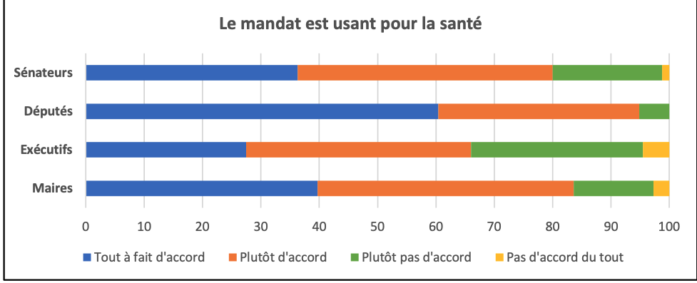 une grande majorité des élu·es déclarent devoir souvent ou parfois « travailler de manière excessive », deux-tiers expliquent devoir souvent « penser à trop de choses à la fois », deux-cinquième être souvent « sous pression », les trois-quarts devoir souvent ou parfois « cacher ses émotions ».