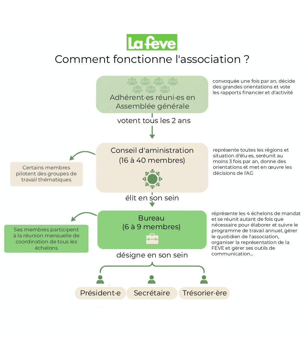 La FEVE est une association dirigée par un Conseil d’administration paritaire, composé de 16 à 40 membres élu·es pour deux ans lors de l’Assemblée générale. Il rassemble des élu·es en mandat ainsi que des ancien·nes élu·es toujours engagé·es dans la vie de l’association.